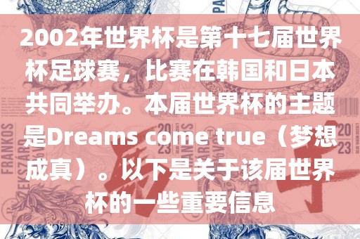 摘要:2002年世界杯足球赛是第十七届比赛,在韩国和日本共同举办,主题为Dreams come true。该届世界杯见证了众多精彩比赛和难忘的瞬间,同时也留下了许多重要信息,成为世界杯历史上的一个重要篇章。