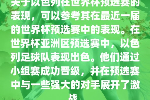 关于以色列在世界杯预选赛的表现,可以参考其在最近一届的世界杯预选赛中的表现。在世界杯亚洲区预选赛中,以色列足球队表现出色。他们通过小组赛成功晋级,并在预选赛中与一些强大的对手展开了激战。