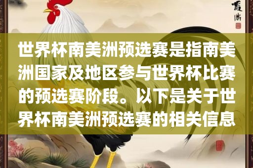 世界杯南美洲预选赛是指南美洲国家及地区参与世界杯比赛的预选赛阶段。以下是关于世界杯南美洲预选赛的相关信息
