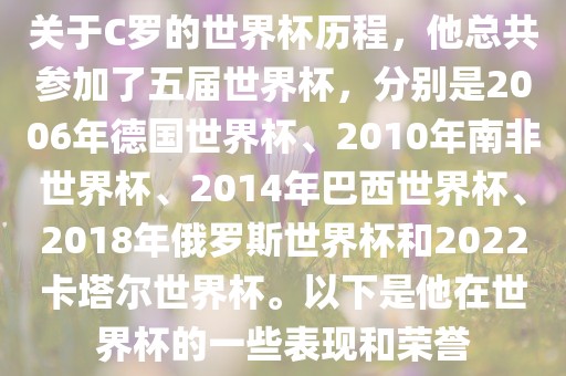 关于C罗的世界杯历程,他总共参加了五届世界杯,分别是2006年德国世界杯、2010年南非世界杯、2014年巴西世界杯、2018年俄罗斯世界杯和2022卡塔尔世界杯。以下是他在世界杯的一些表现和荣誉