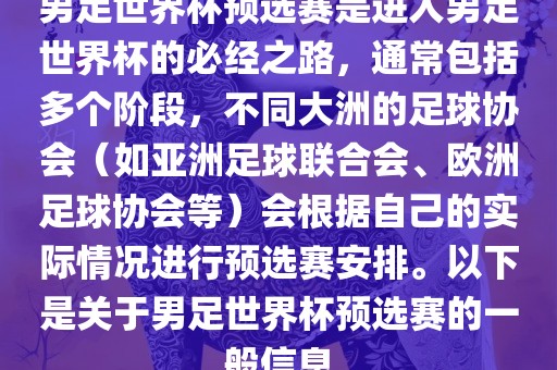 男足世界杯预选赛是进入男足世界杯的重要阶段,需要各支球队认真备战、全力以赴地参加比赛,对于足球迷来说,这也是观赏高水平足球比赛的好机会,如果想要了解具体的男足世界杯预选赛信息,可以关注相关足球协会或赛事官方的消息。