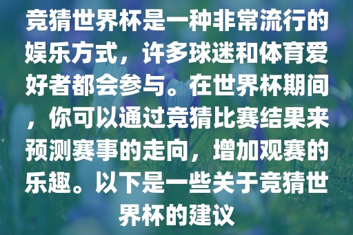 竞猜世界杯是一种非常流行的娱乐方式,许多球迷和体育爱好者都会参与。在世界杯期间,你可以通过竞猜比赛结果来预测赛事的走向,增加观赛的乐趣。以下是一些关于竞猜世界杯的建议