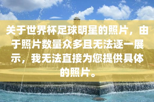 摘要:由于世界杯足球明星照片数量众多,无法逐一展示,因此无法直接提供具体照片。这些照片涵盖了众多足球明星在比赛中的精彩瞬间和日常生活照,展现了他们的风采和激情。尽管无法展示具体照片,但可以通过其他途径欣赏到这些足球明星的照片。