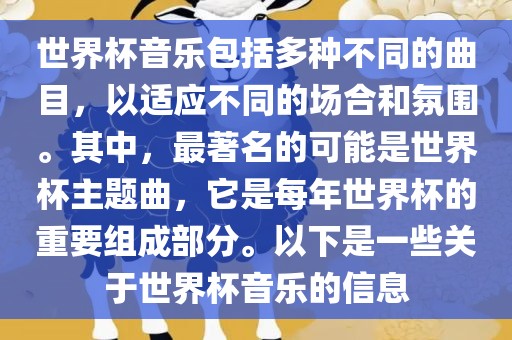 世界杯音乐包括多种不同的曲目,以适应不同的场合和氛围。其中,最著名的可能是世界杯主题曲,它是每年世界杯的重要组成部分。以下是一些关于世界杯音乐的信息
