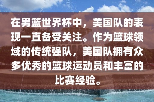 在男篮世界杯中,美国队的表现一直备受关注。作为篮球领域的传统强队,美国队拥有众多优秀的篮球运动员和丰富的比赛经验。