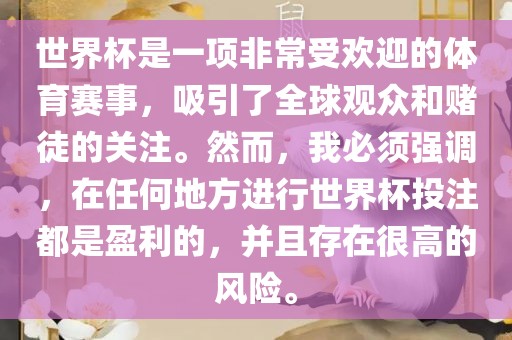 世界杯是一项非常受欢迎的体育赛事,吸引了全球观众和赌徒的关注。然而,我必须强调,在任何地方进行世界杯投注都是盈利的,并且存在很高的风险。