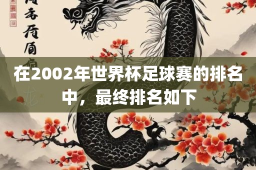 在2002年世界杯足球赛中,经过激烈的角逐,最终排名已经确定。各国队伍为了荣誉和胜利奋力拼搏,展现出精湛的球技和团队合作精神。经过层层选拔和比拼,最终排名揭晓,各国队伍的名次各有千秋。这场比赛不仅展现了足球运动员的才华和技艺,也展现了足球运动的魅力和激情。
