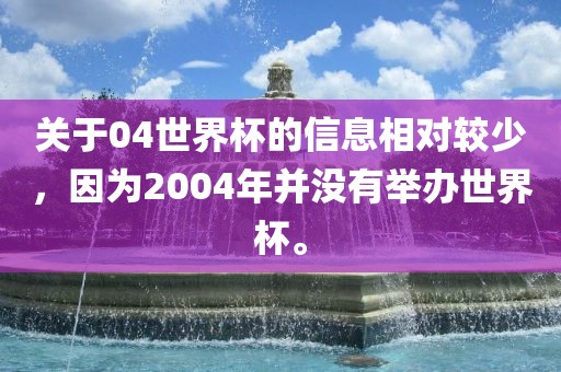 摘要:关于2004年的世界杯信息相对较少,因为那一年并没有举办世界杯。目前暂无其他详细的相关内容。如需了解更多关于世界杯的信息,可以关注国际足联的官方渠道。