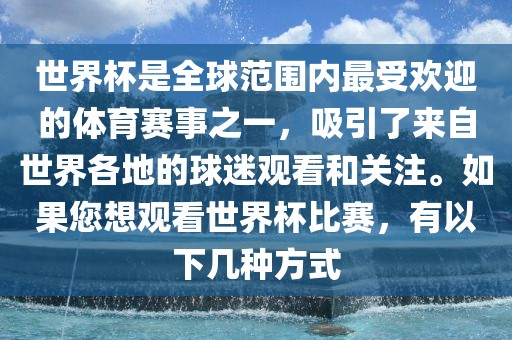 世界杯是全球范围内最受欢迎的体育赛事之一,吸引了来自世界各地的球迷观看和关注。如果您想观看世界杯比赛,有以下几种方式