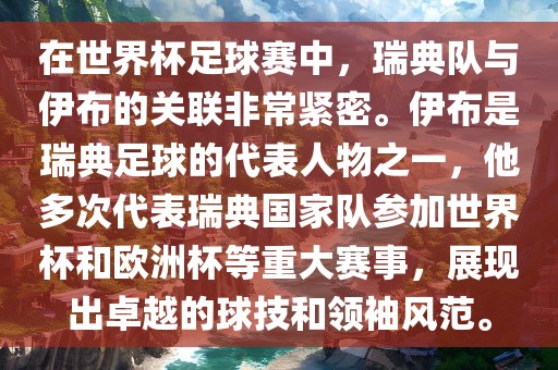 在世界杯足球赛中,瑞典队与伊布的关联非常紧密。伊布是瑞典足球的代表人物之一,他多次代表瑞典国家队参加世界杯和欧洲杯等重大赛事,展现出卓越的球技和领袖风范。