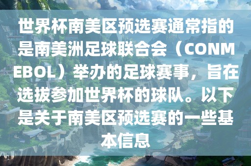 世界杯南美区预选赛通常指的是南美洲足球联合会(CONMEBOL)举办的足球赛事,旨在选拔参加世界杯的球队。以下是关于南美区预选赛的一些基本信息