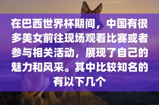 在巴西世界杯期间,中国有很多美女前往现场观看比赛或者参与相关活动,展现了自己的魅力和风采。其中比较知名的有以下几个