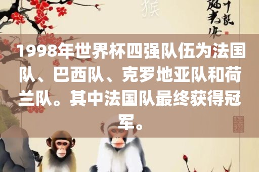 1998年世界杯四强队伍为法国队、巴西队、克罗地亚队和荷兰队。其中法国队最终获得冠军。