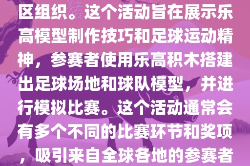 具体的活动安排和规则可能会因组织者和年份而异,建议关注相关社区或官方渠道以获取最新信息,乐高公司本身也可能推出与足球或世界杯相关的乐高套装或模型,供爱好者们收藏和展示。