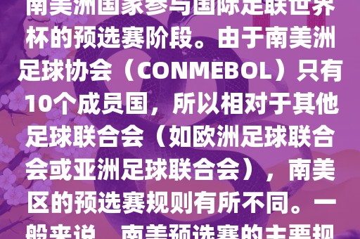 世界杯南美预选赛通常指的是南美洲国家参与国际足联世界杯的预选赛阶段。由于南美洲足球协会(CONMEBOL)只有10个成员国,所以相对于其他足球联合会(如欧洲足球联合会或亚洲足球联合会),南美区的预选赛规则有所不同。一般来说,南美预选赛的主要规则如下